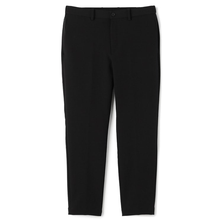 ハイストレッチのセットアップにモックネックセーターを合わせた、上品で洗練された休日スタイルです。