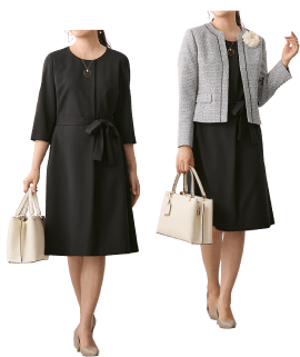 上品なノーカラーデザインのツイードジャケットにシフォンブラウスとのドッキングワンピースのセットなら1着で華やかなセレモニースタイルに。