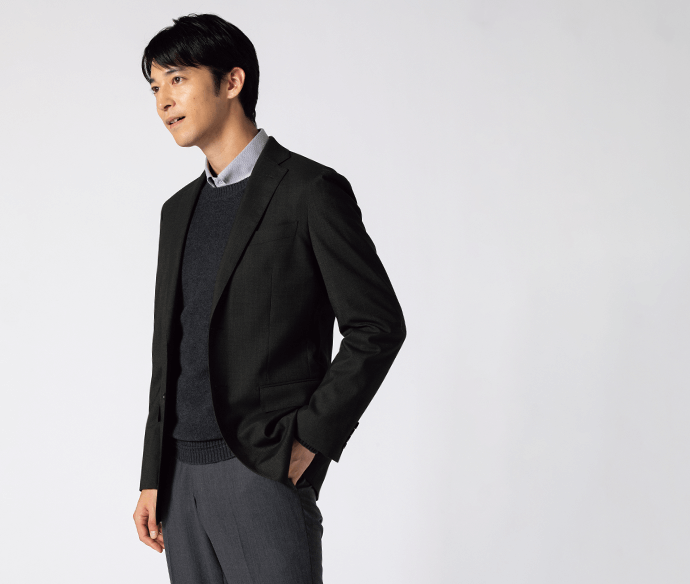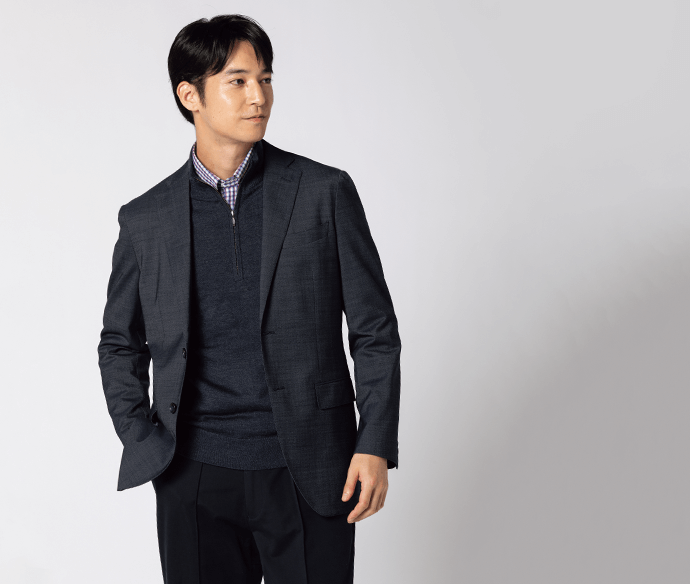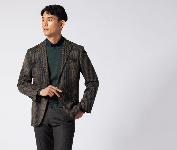 ジャケットのベースカラーのグレーと柄色のブラウンに合わせたインナーを使用することで、カラーバランスの取れたスタイリングになります。