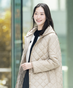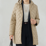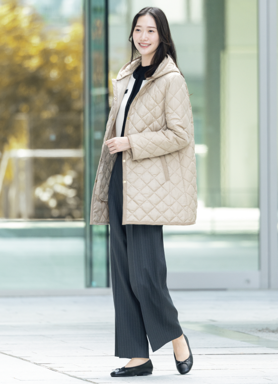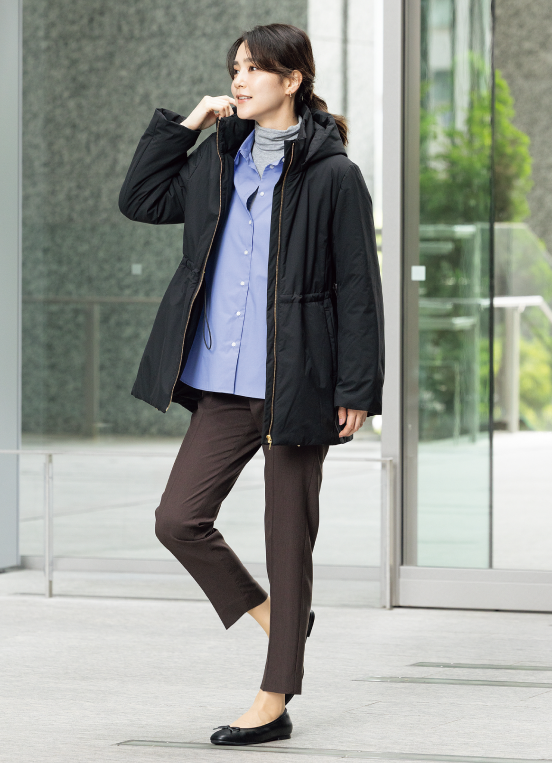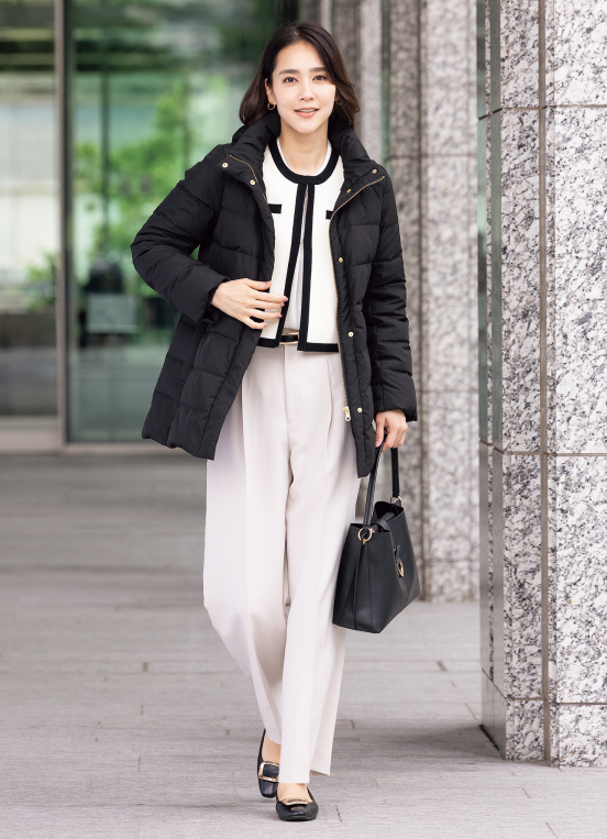軽やかさと上品さを両立した、大人のダウンコート。着ぶくれしないすっきりとしたシルエットは、ダウンコート特有のカジュアルさを抑え、エレガントな印象を与えます。