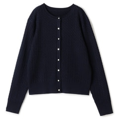 ケーブル模様の大きさや編みにこだわったふんわりとしたカーディガン。程よい厚みなのでトップスとしてジャケットのインナーにしてももたつかないのが優秀。カジュアルに見えがちなケーブルニットだけれど前を留めれば、縦一列に並んだゴールド釦がモダンな印象を引き寄せてくれる。