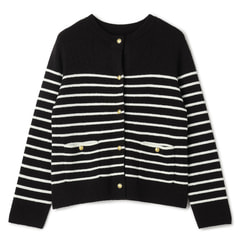 黙々と資料作成に取り組む、デスクワークの日にもニットジャケットが最適! いつものパンツスタイルも、ジャケットをボーダー柄ニットジャケットにチェンジするだけで、着こなしにこんなにもワクワク感が生まれて。黒の分量が多めのモノトーンとゴールド釦の輝きで、ほっこりしすぎないのも、このニットジャケットの素敵ポイント。