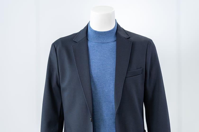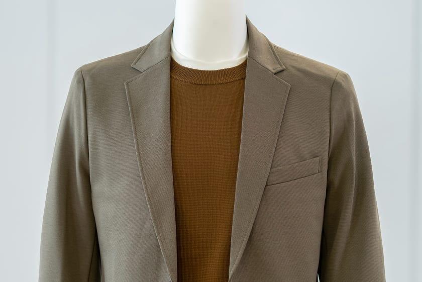 「鍵を握るのは、"組成"です。生地づくりは非常に繊細な工程の積み重ねです。たとえば"縮み"ひとつ取っても、素材の組み合わせで結果がまったく違ってきます。綿やポリエステル、ナイロンなどをバランスよく混ぜ合わせることで、縮みにくく、肌触りがよく、シルエットもきれいに出るよう設計しています。ただし、素材が複雑になればなるほどデータ管理や検証は難しくなります。素材メーカーと綿密なやり取りを重ね、最適な配合を探りながら、理想の風合いを追求しました。伸縮性の高いジャージ素材をスーツの形に仕立てるには、高度な縫製技術も欠かせません。お客様が求めているのは、"簡単に洗えて、着心地が良く、きちんと見える"スーツ。その期待に応えるため、見えない部分でも細かい試行錯誤を繰り返して完成させました」
