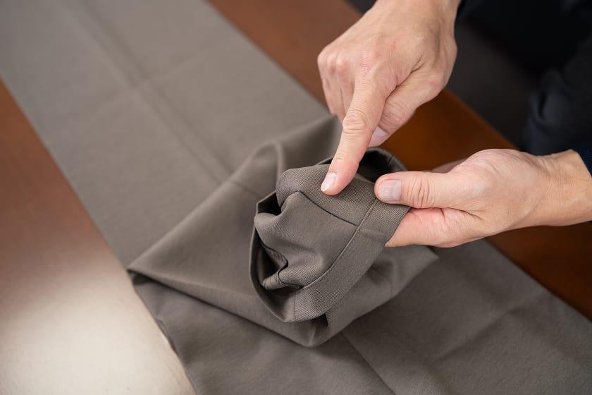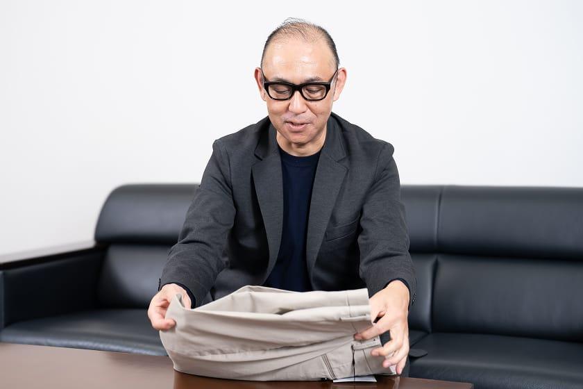 「パンツのクリースラインの裏側には、厚手の生地でも折り目が消えにくくなる樹脂加工を施しました。高温でプレスすると合繊が溶けたり、色が変わるリスクがあります。そこで、裏側に熱で定着する樹脂を仕込むことで、美しいセンタークリースをキープできるようにしました。ご家庭でのアイロン掛けでも線がきれいに決まります」