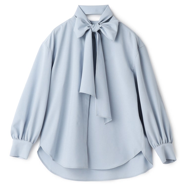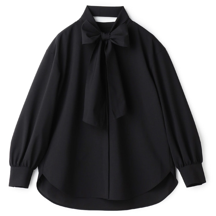 取り外し可能なボウタイで、リボンスタイルから知的なノーカラーまで印象を変えられます。優雅なボリューム袖が華やかさを添え、裾はイン・アウトどちらも美しく決まる仕様。