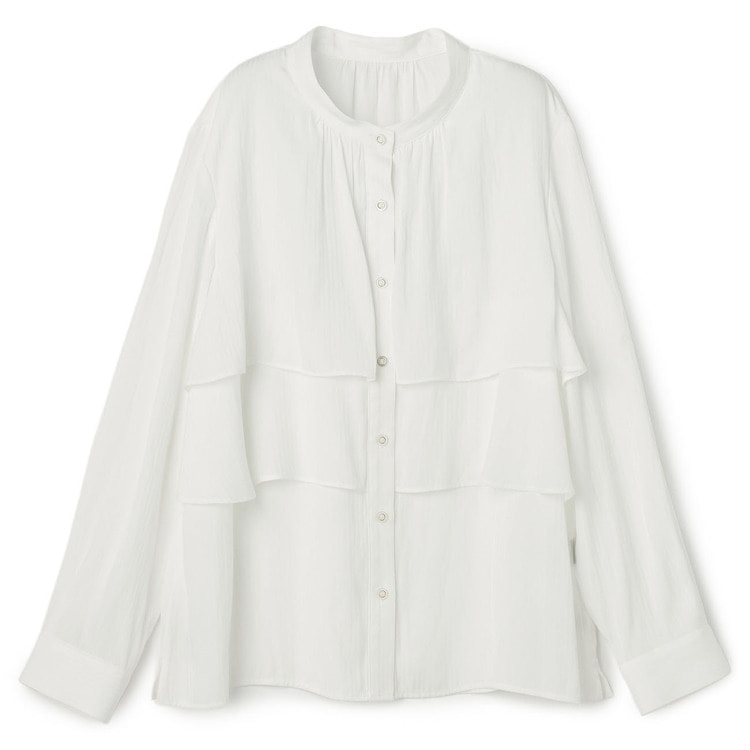 胸元の2段フリルが、単調になりがちな装いに優雅な動きと華やぎを添えます。ふんわりとした素材感と適度なシアー感で、涼しげな抜け感を演出。一枚ではもちろん、ニットやベストとのレイヤードも楽しめるため、着回し力も抜群です。