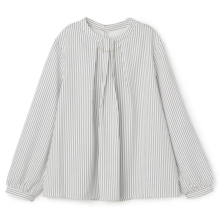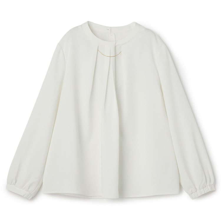 胸元のゴールドパーツが煌めき、顔周りに上品な明るさを添えてくれます。パーツは取り外し可能で、シンプルなタックブラウスとしても楽しめるのが嬉しいポイント。