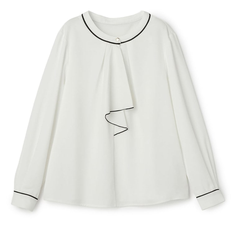 甘さを抑えたラッフルデザインが、顔周りを華やかに、かつ知的に彩ります。首元のゴールドボタンとパイピングのメリハリが洗練されたアクセントに。