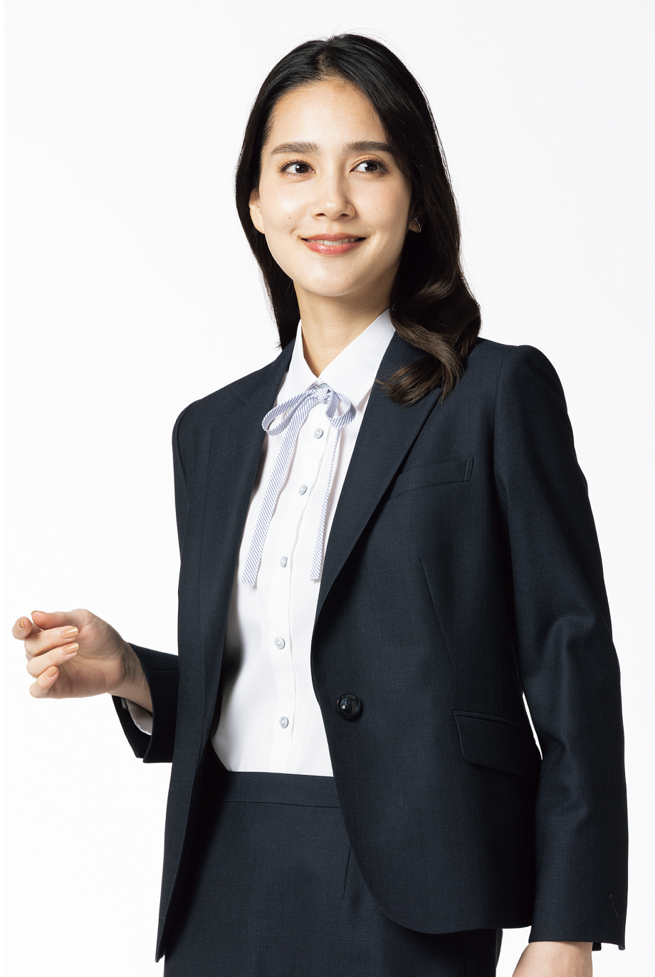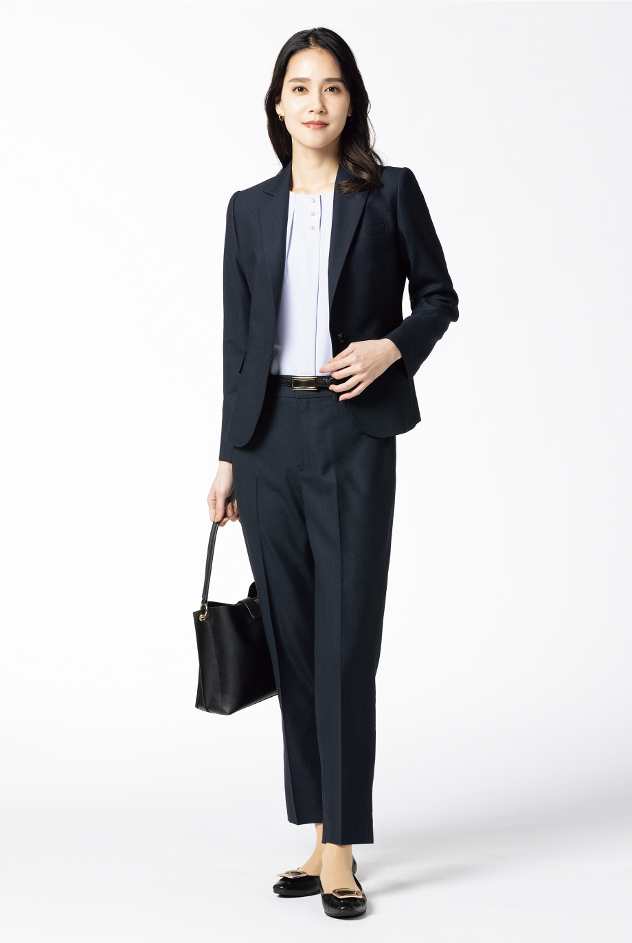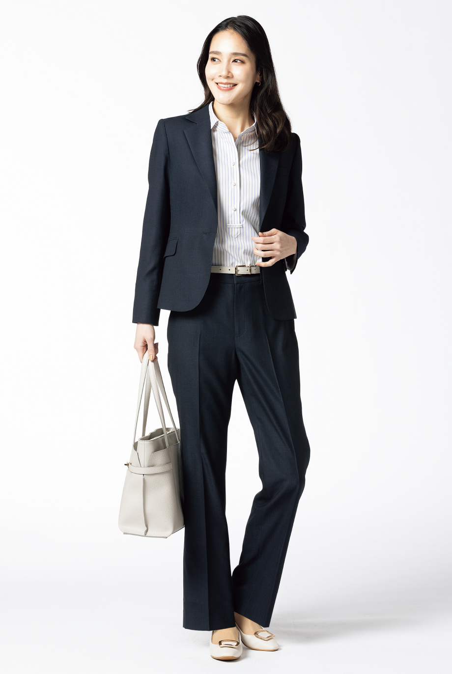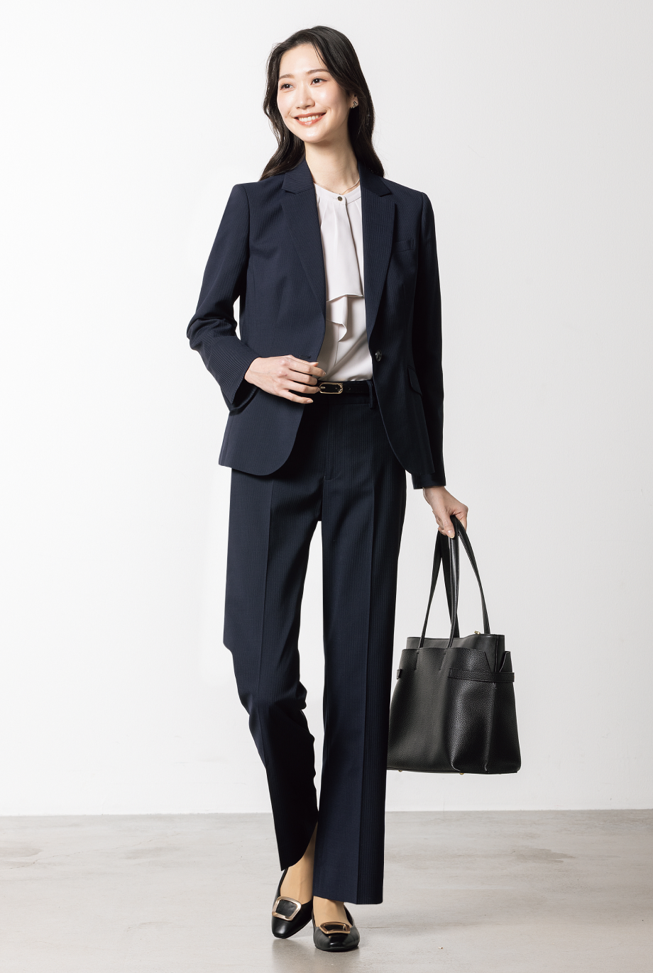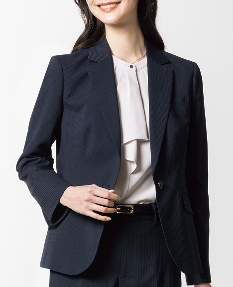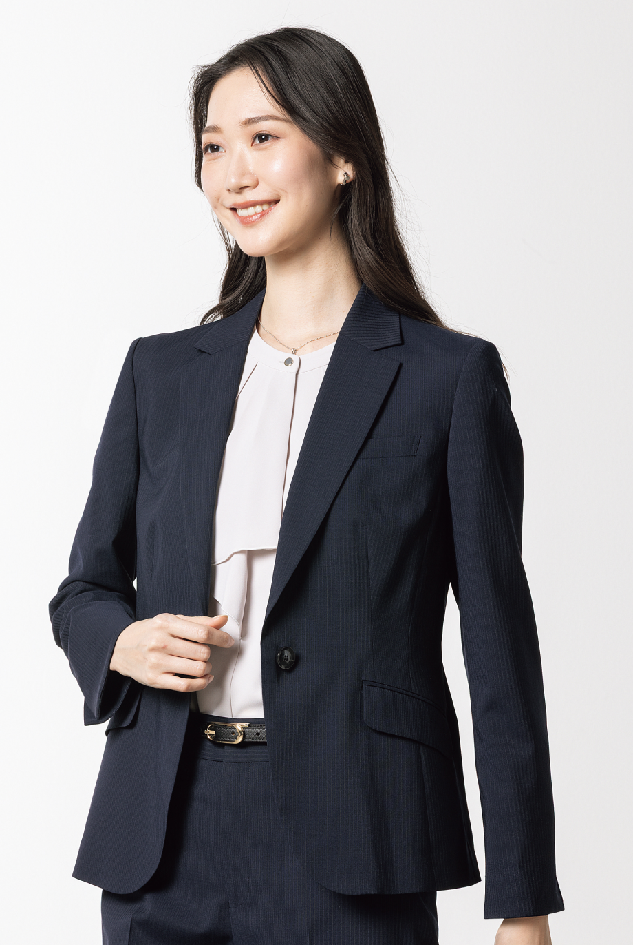 引き締め効果のある紺に繊細なストライプが施された、信頼感溢れる1着。 縦のラインが強調されることでシャープなシルエットが際立ち、 どんなに暑い日でも周囲に凛とした端正な印象を与えます。 ボウタイブラウスやカットソーなど、インナー次第でマニッシュにもエレガントにも表情を変えるのも魅力です。