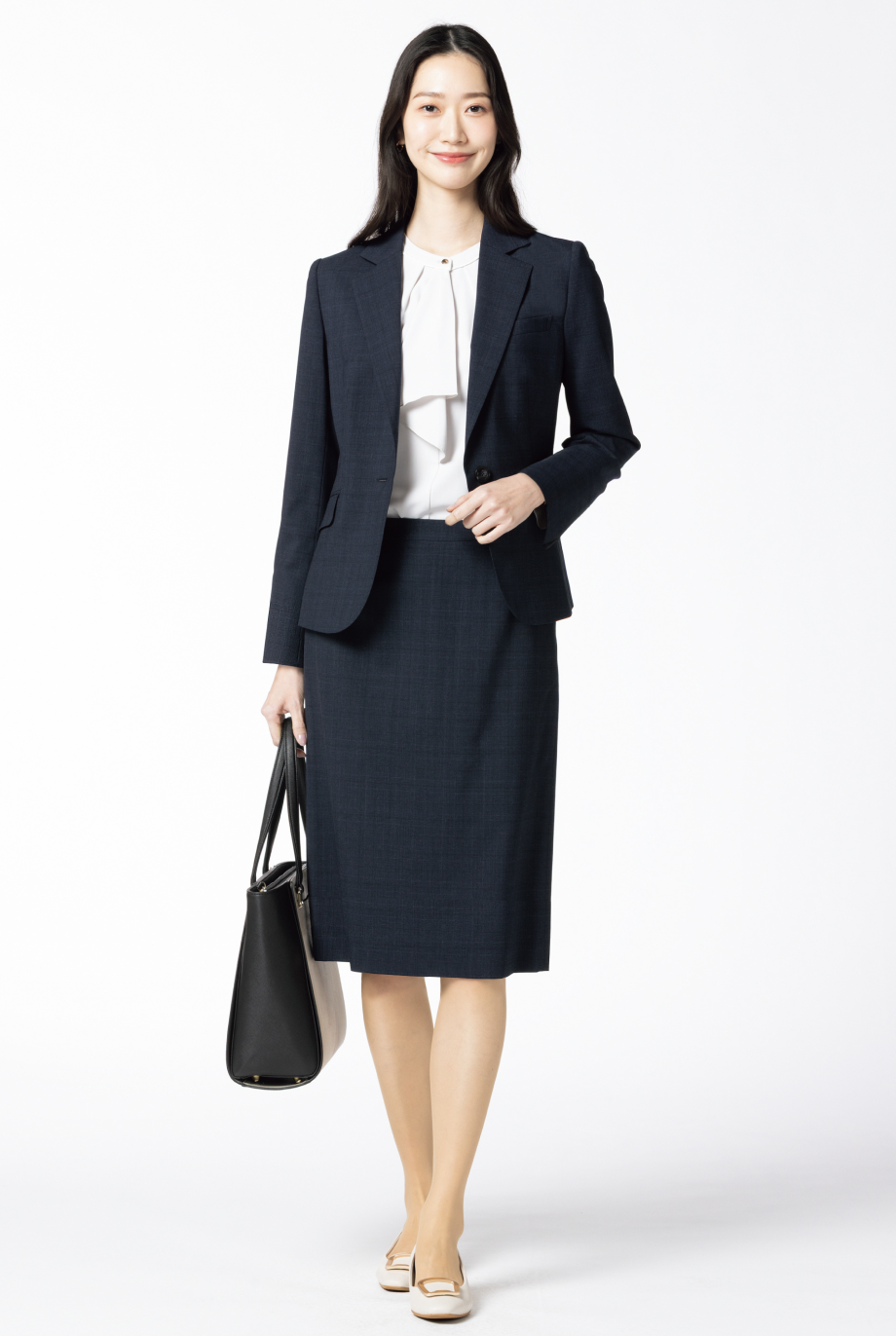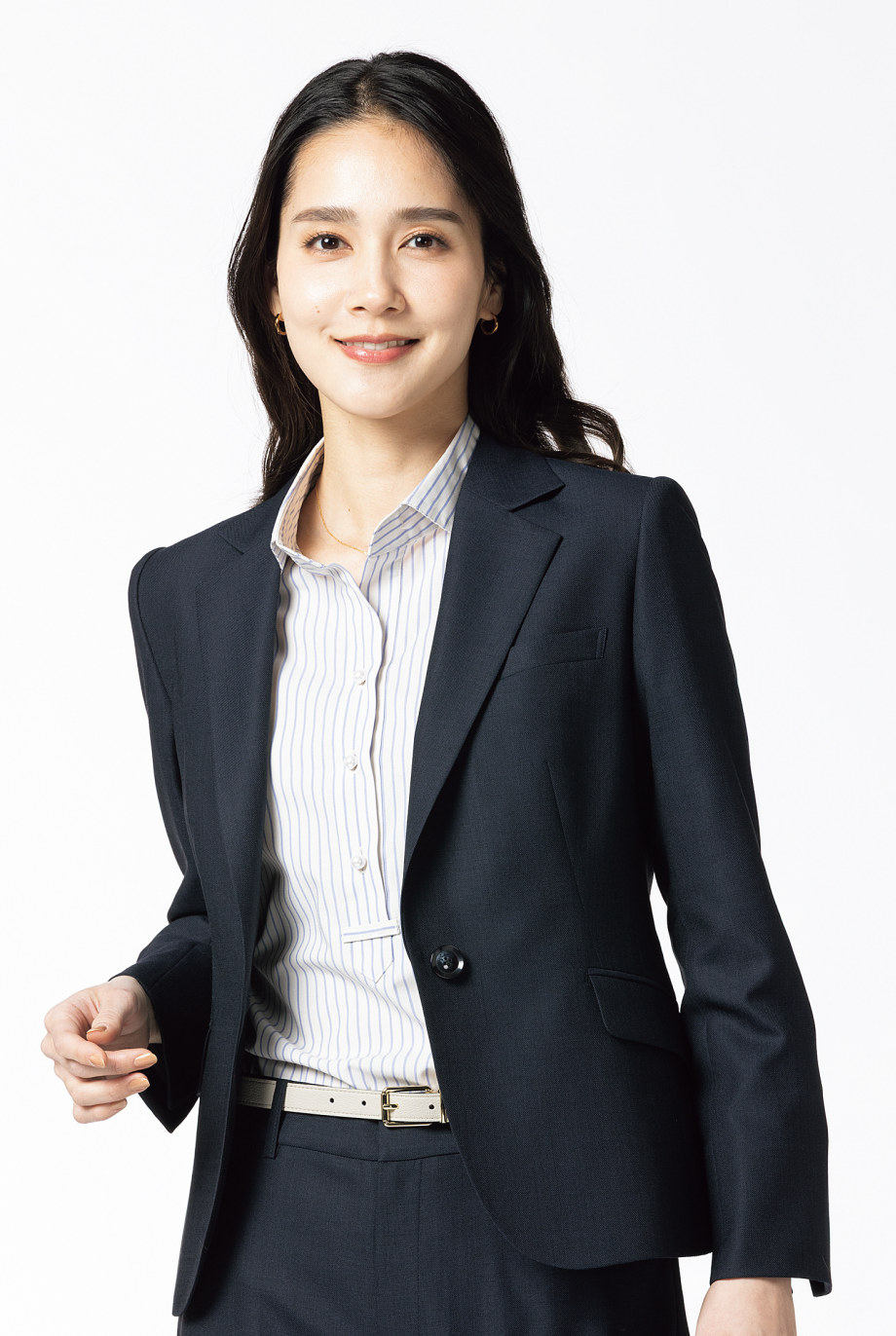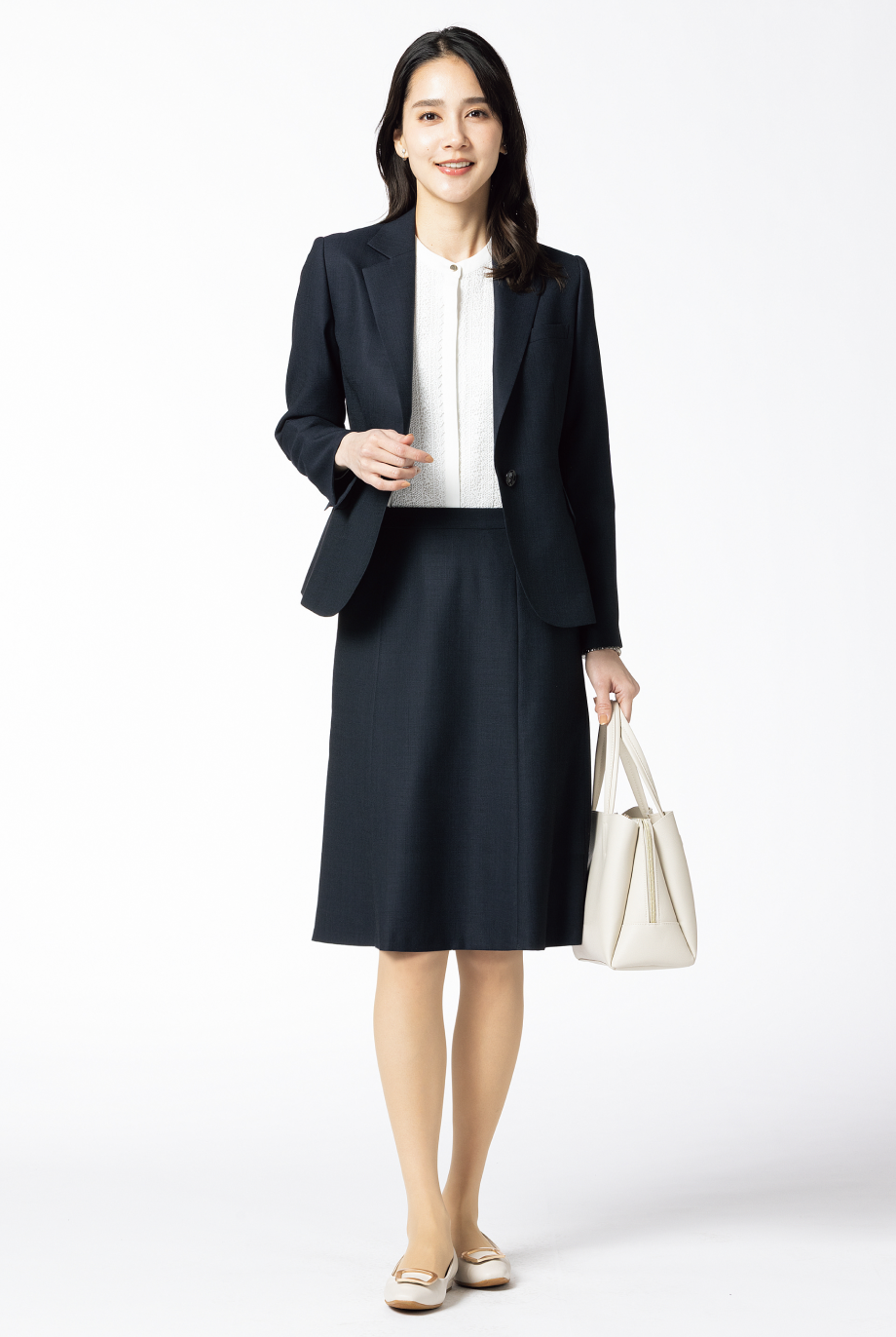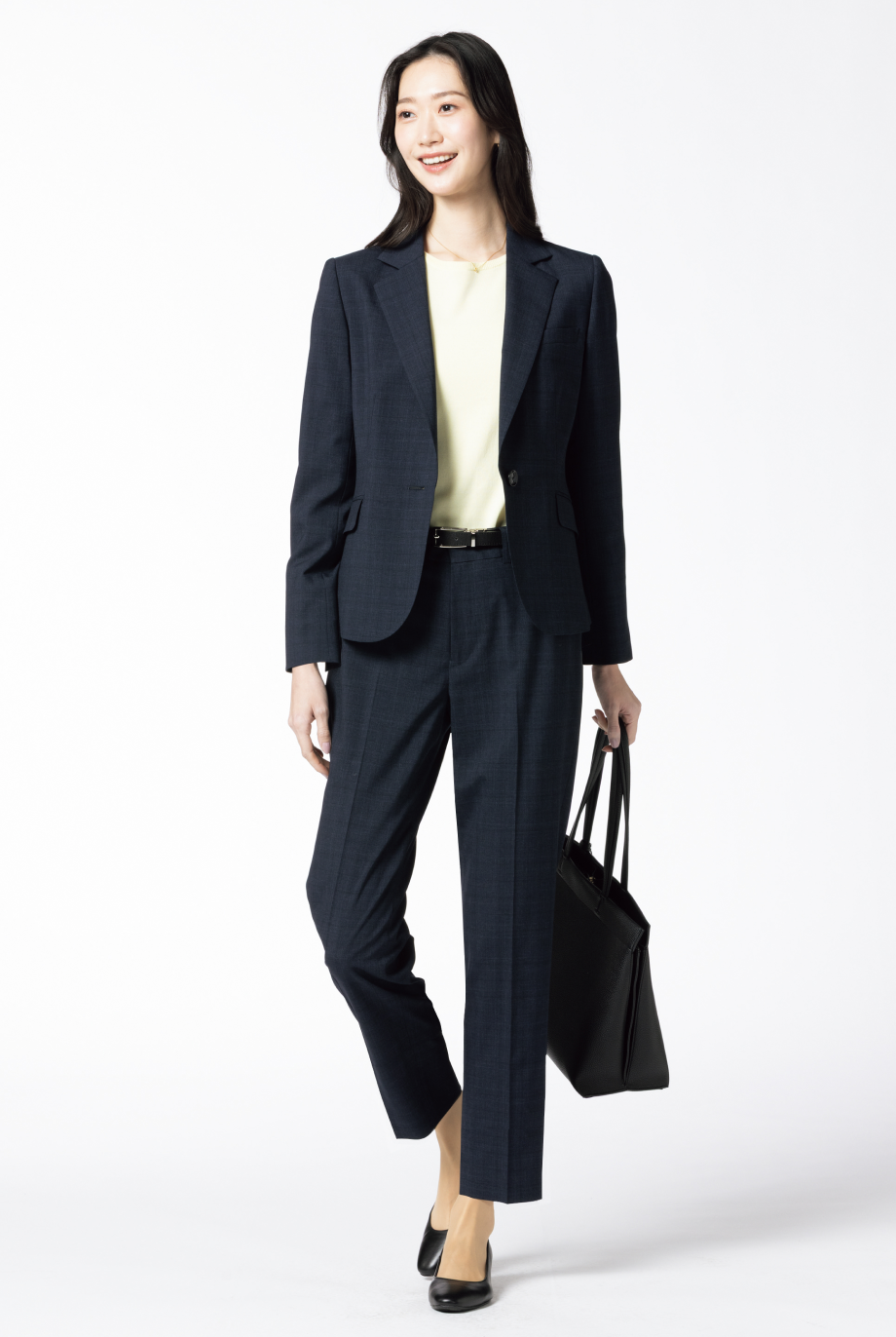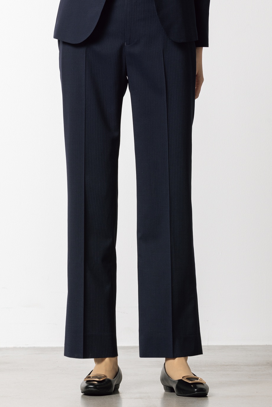 引き締め効果のある紺に繊細なストライプが施された、信頼感溢れる1着。 縦のラインが強調されることでシャープなシルエットが際立ち、 どんなに暑い日でも周囲に凛とした端正な印象を与えます。 ボウタイブラウスやカットソーなど、インナー次第でマニッシュにもエレガントにも表情を変えるのも魅力です。